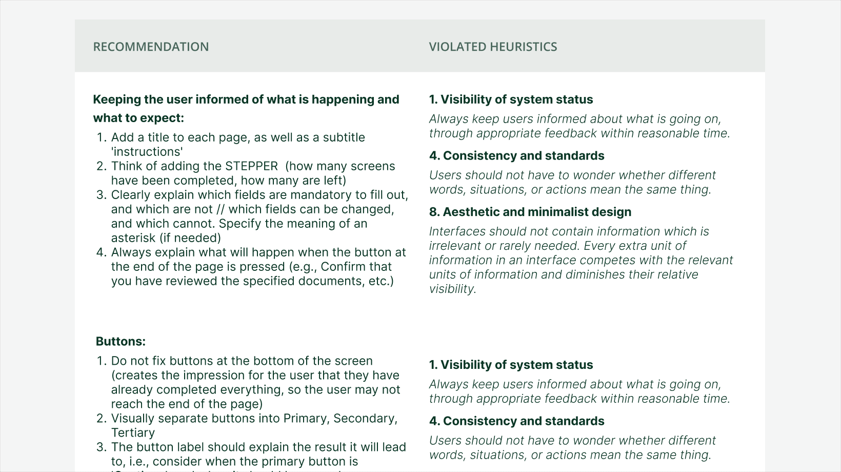 With no budget for usability testing, I needed a way to uncover real usability issues without direct user feedback. I conducted stakeholder interviews (project owner, PM, business analyst, and developers) and a heuristic evaluation against usability and accessibility standards.